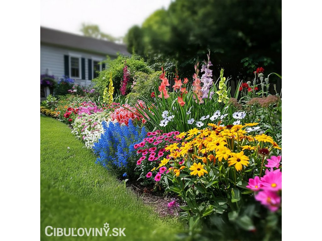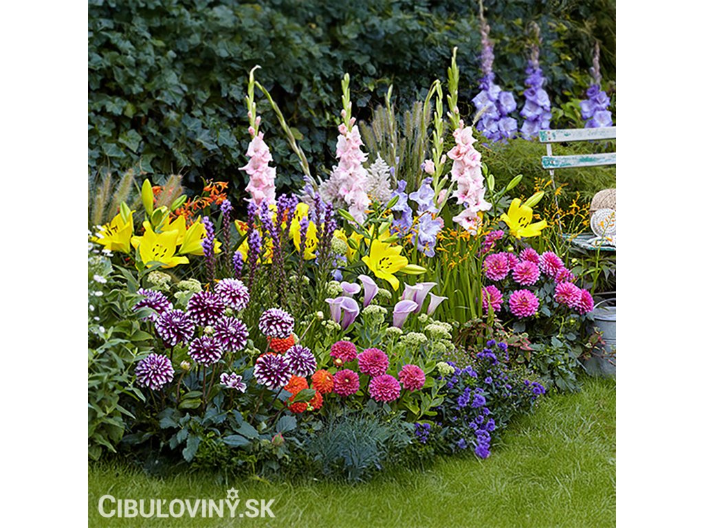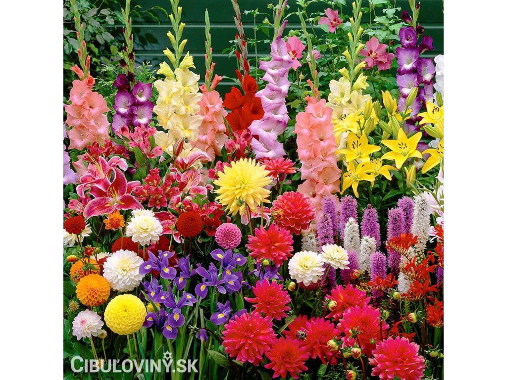 Zostava tých najkrajších letných cibuľovín: Gladioly, ľalie, štvorlístky, frézie, liatrisy, montbrécie, acidanthery, kosatce, sasanky, cesnaky, babiany, tigrice, dúhovnice a sparaxis. Neobsahuje begónie, kaly ani georgíny. Kvitnúce záhrada od leta až do jesene.