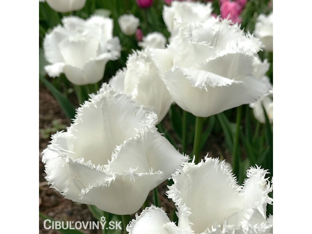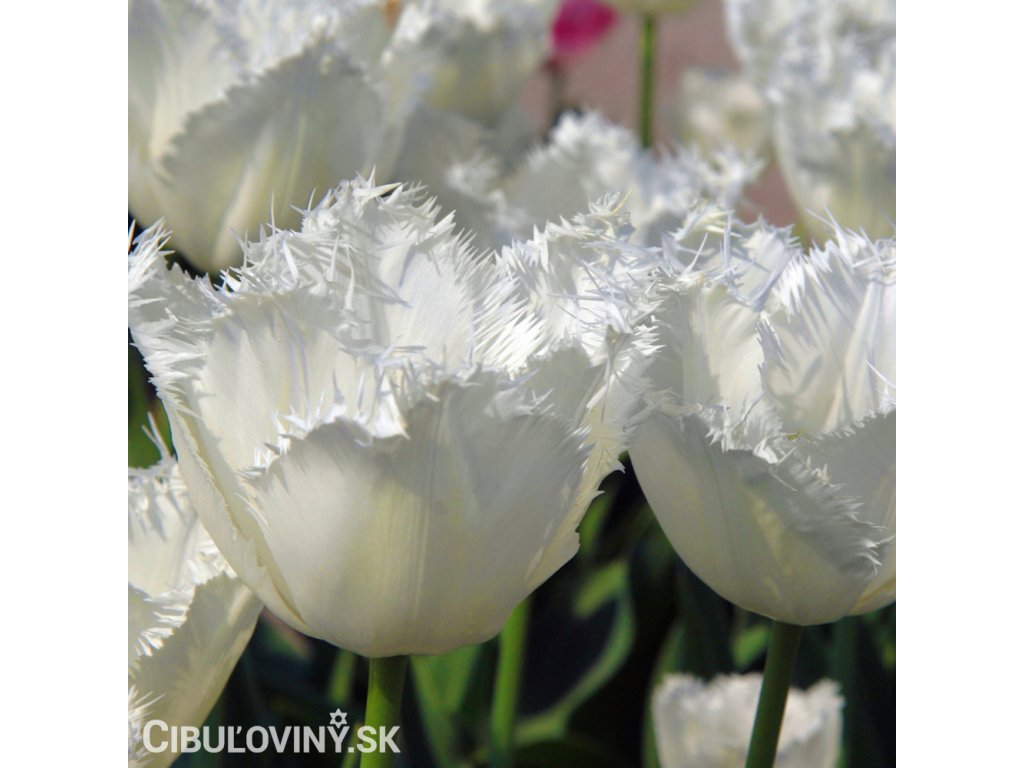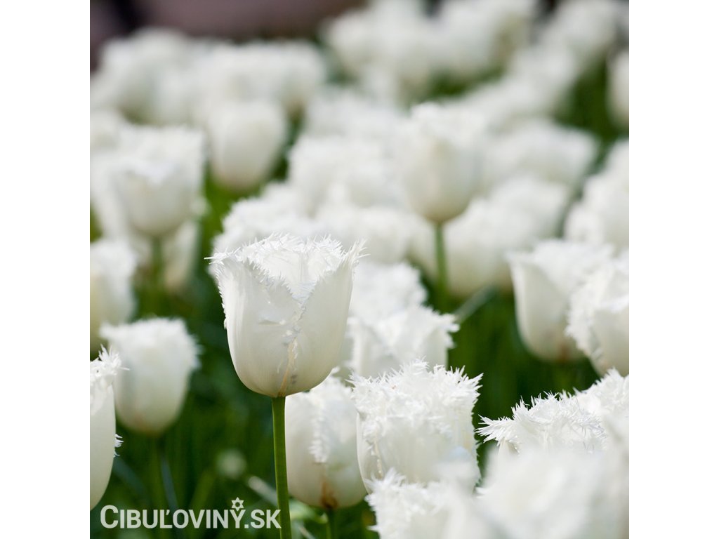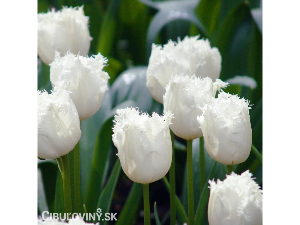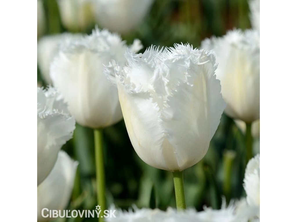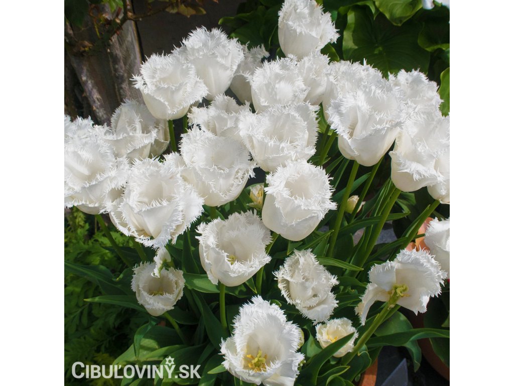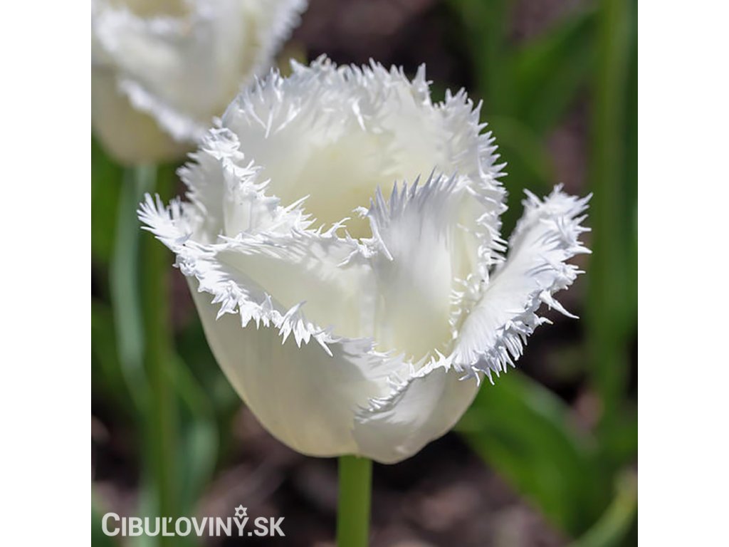 Čistobiely rozstrapkaný tulipán s veľkým kvetom na pevnej stonke. Výška 40 cm.